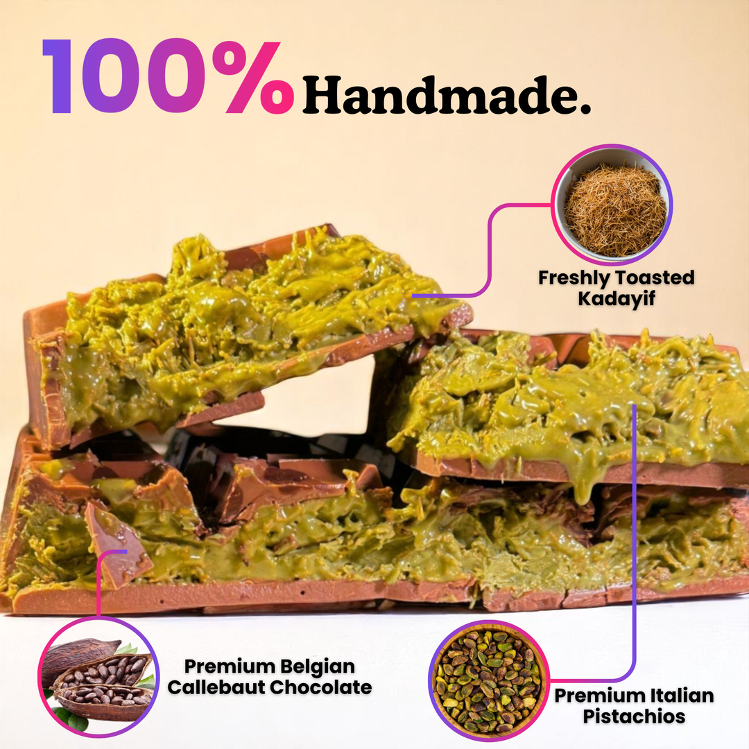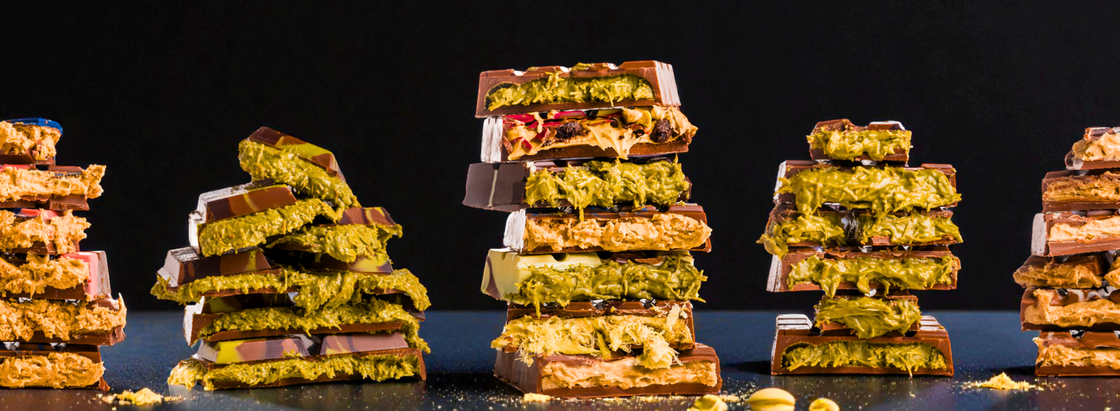 Our approach . While other brands took the easy way out, we went all the way. We flew to Belgium and collaborated with chocolate masters. Hand-selected Sicilian pistachios. Authentic Middle Eastern Knafeh. 100% pure ingredients.